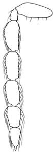 Flagellum thick, second flagellomere 1.9X as wide as pedicel; frontal suture reaches eyes in level with anterior margin of anterior ocellus; forewing costal cell ventrally with a sparse row of setae in apical ½; propodeum with irregular sculpture medially or completely smooth, propodeal callus with five setae.