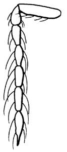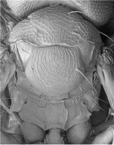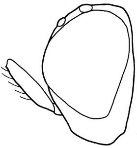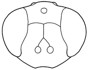 Frons narrow between eyes at the level of frontal suture, ratio distance between eyes at this level/width of head= 0.4; frontal suture down-curved laterally; malar sulcus absent; pronotum without transverse carina; scutellum 0.8X as long as wide; all coxae yellowish-white.