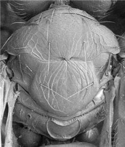 Malar sulcus present; setae on frons below frontal suture not confined to margin along eyes, but removed out on frontal surface; thoracic dorsum flat to slightly convex; female scutellum transverse, 0.7X as long as wide; femora dark; propodeum golden-purple, without anterolateral foveae.