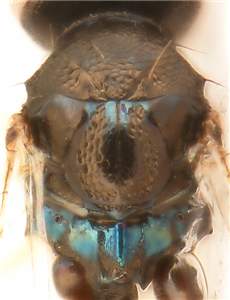 Scutellum predominantly with raised and strong reticulation, laterally and medially with engraved and very weak reticulation, median groove almost complete; clypeus protruding and bilobed; frons close to vertex with raised and very strong reticulation; vertex with raised and strong reticulation; forewing speculum open below; propodeum with median carina long and narrow, LC/WC = 4.9; propodeal callus with four setae.< /FONT >