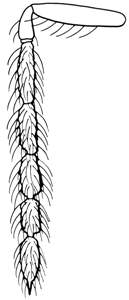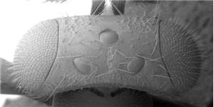 Vertex with engraved reticulation, posterior part with a median groove; mesoscutum with raised reticulation in female, midlobe of mesoscutum with engraved reticulation and sidelobes with raised reticulation in male; propodeal callus with 7-14 setae; coxae dark and metallic in both sexes; costal cell with a row of setae on ventral surface; petiole 2.6X as long as wide in female, 3.7X in male; first gastral tergite with posteromedian 1/3 reticulate; male scape white. Similar to albiscapus but with a row of setae on underside of costal cell.