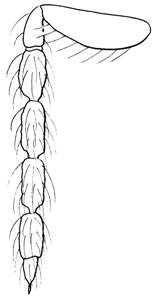 Eyes large, DE/DO = 2.8; scutellum with anterior part of lateral mesh-rows expanded; hind tibial spur long, LS/LT = 0.44. < /FONT >