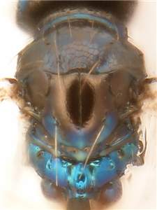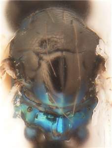 Mesoscutum and scutellum metallic dark purple; mesoscutum with raised reticulation, notauli indistinct; scutellum with engraved and very weak reticulation.