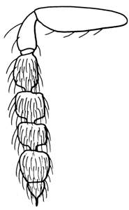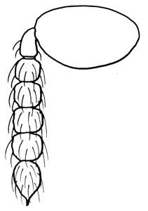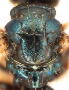 Antennal scrobes join just below frontal suture; mesoscutum with anterior 2/3 with raised and weak reticulation, posterior 1/3 with engraved reticulation; scutellum flat, with engraved and weak reticulation; mesoscutum and scutellum metallic bluish-green; propodeal callus with five setae; femora metallic bluish-green; tibiae yellowish-brown; male scape strongly swollen.