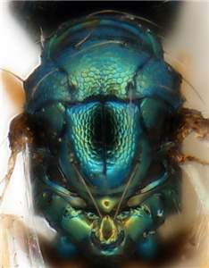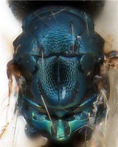 Mesoscutum and scutellum dark golden-green, metallic bluish-green or bluish-purple, mesoscutum with raised and strong reticulation, scutellum with engraved and rather strong reticulation; femora metallic bluish-green with apex yellowish-white; tibiae yellowish-white; propodeum with submedian grooves reticulate; first gastral tergite with posterior ½ with weak and round to strong and elongate punctures. See also aphantus, dolichopygus, and