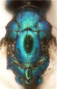 Antennal scrobes join frontal suture with a distance between points of joining; mesoscutum with raised and weak reticulation, midlobe with posterior ½ with engraved and weak reticulation, notauli indistinct or as distinct narrow grooves posteriorly; mesoscutum and scutellum metallic bluish-green; female petiole 1.4-2.0X as long as wide. Similar to cupreus but with mesoscutum partly with raised reticulation and female petiole 1.4-2.0X as long as wide. See also citrus, laselvae and naganus.