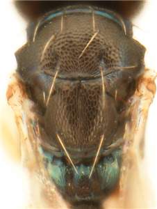 Frons above frontal suture reticulate; fore and mid coxae yellowish-brown; median propodeum, including median carina, reticulate.