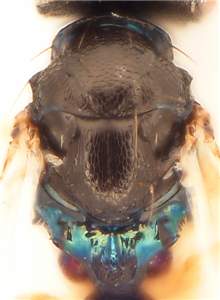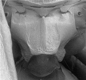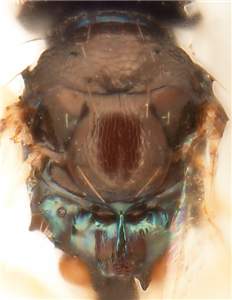 Scutellum with raised and strong reticulation, with a median groove in anterior ½ (the lectotype has this feature more distinct than non-type specimens examined) but with indistinct lateral mesh-rows; median carina on propodeum narrow, LC/WC = 6.1, and pointed in anterior part; propodeal callus with 4-6 setae; forewing speculum open below; male flagellum with a two-segmented clava.< /FONT >