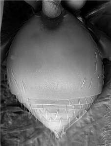 Scutellum with engraved and very weak reticulation, median groove reaches ¾ the length of scutellum; mesoscutum and scutellum metallic bluish-green; propodeal callus with three setae; hind tibial spur long, LS/LT = 0.31; petiole 1.4X as long as wide; gaster short, MM/LG = 1.1, with 1st tergite large, 0.7X as long as length of gaster. Similar to anisus but with femora yellowish-brown and female gaster short.