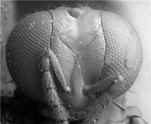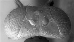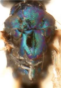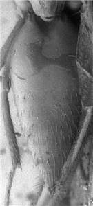 Antennal scrobes join below frontal suture; eyes large, DE/DO = 3.4; shortest distance between eyes just below level of toruli; propodeum with median carina with parallel sides; first gastral tergite smooth.< /FONT >