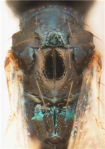 Mesoscutum with midlobe metallic bluish-green, sidelobes metallic dark purple, with raised and strong reticulation; notauli with posterior ½ as narrow and distinct semicircular grooves; scutellum metallic dark purple with engraved and very weak reticulation, almost smooth; femora and tibiae dark brown; propodeum with median carina long and narrow, LC/WC = 7.4; petiole with a smooth median carina. See also oviesus.
