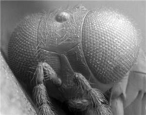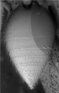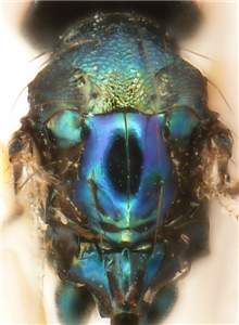 Eyes large, DE/DO = 3.4; antennal clava with ultimate segment small; costal cell with a row of setae on ventral side; scutellum smooth and shiny; petiole 2.0X as long as wide.< /FONT >
