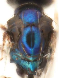 Mesoscutum two-coloured: midlobe metallic bluish-purple or bluish-green, sidelobes metallic dark purple; scape and femora dark brown, gaster with first tergite smooth and shiny; male with all tibiae dark brown, female with only hind tibia dark brown.