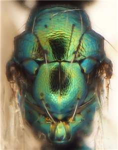 Mesoscutum and scutellum golden-green with or without blue tinges; mesoscutum with anterior ½ with raised and weak reticulation, posterior ¼ with engraved reticulation, notauli as narrow and distinct grooves in median 1/3; scutellum with engraved and weak reticulation; gaster with last tergite long and narrow, 2.7X as long as width at base; petiole short and transverse, 0.3X as long as wide.