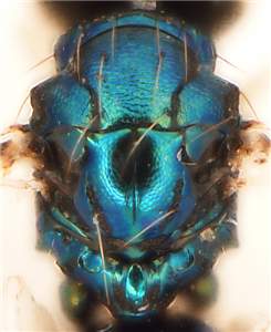 Antennal clava in female strong, 1.8X as wide as width of 1st flagellomere; clava rounded at apex; mesoscutum and scutellum metallic bluish-green; notauli as narrow and distinct grooves in posterior ½; petiole 1.2X as long as wide. Similar to sardus but with mesoscutum and scutellum more elongate and bright metallic bluish-green, with posterior ½ of notauli straight, and without the two distinct reticulate patches on upper frons. See also cockerelli.