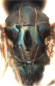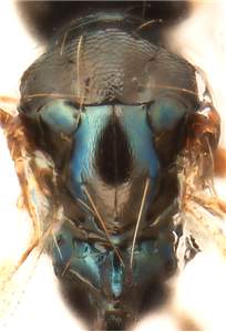 Mesoscutum metallic dark purple with engraved and rather strong reticulation, notauli indistinct; scutellum metallic bluish-green with engraved and very weak reticulation; femora and tibiae pale brown to dark brown; propodeum with median carina long with sides parallel; petiole long, 3.2X as long as wide in female, 2.9X in male.
