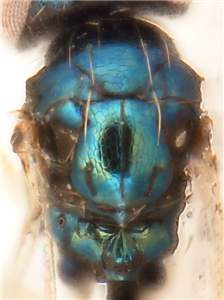 Midlobe of mesoscutum with posterior 1/3 with raised reticulation; scutellum with engraved reticulation; mesoscutum metallic bluish-green and scutellum golden-green; hind tibial spur long, LS/LT = 0.36; 1st gastral tergite large, covers 0.7X the length of gaster.