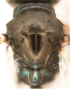 Mesoscutum and scutellum metallic dark purple, mesoscutum with raised and weak reticulation, midlobe with posterior 1/3 with engraved or raised reticulation, scutellum with engraved and weak reticulation; female with femora and tibiae golden-green, male with fore femur yellowish-white to dark brown, mid and hind femora dark brown, tibiae yellowish-white; propodeal callus with 2-3 setae; propodeum with submedian grooves and anterolateral foveas reticulate and with posterior ¼ of median carina reticulate, median carina with sides diverging towards posterior part; first gastral tergite with weak punctures posteriorly.