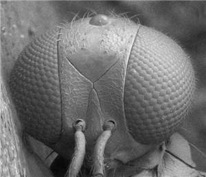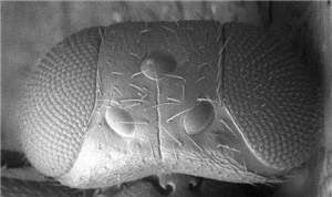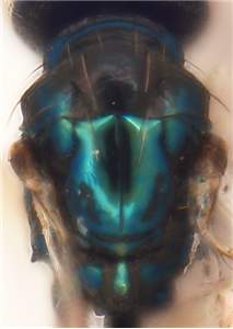 Antennal scrobes join below frontal suture; eyes large (Fig. 1050), DE/DO = 3.2; mesoscutum reticulate and scutellum smooth; first gastral tergite with a reticulate band close to posterior margin; small species, 1.3-1.4 mm. Similar to euscopus, differs in having a reticulate band close to posterior margin of first gastral tergite, antennal scrobes that join below frontal suture, and median propodeum different (median carina narrower and submedian grooves wider).