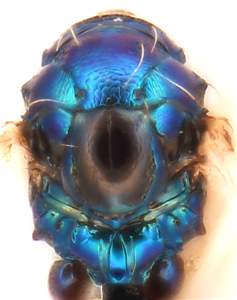 Antennal clava in female strong, 1.4X as wide as width of first flagellomere, without sense area; clava with a spicule at apex; clavomere 1 shorter than 2; eyes large, DE/DO = 3.8; mesoscutum metallic bluish-purple, scutellum metallic dark purple; propodeal callus with three setae.< /FONT >