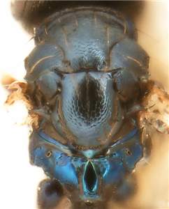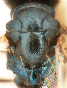 Mesoscutum with anterior 1/3 with raised reticulation, posterior 2/3 with engraved and weak reticulation; scutellum with engraved and weak reticulation; mesoscutum and scutellum metallic dark bluish-green; propodeal callus with 3-5 setae; femora dark brown; tibiae yellowish-white. Similar to steirastomae but male of crassus very distinct through the strongly inflated scape, 1.9X as long as wide (in steirastomae 3.0-3.8X as long as wide).