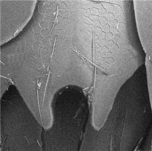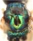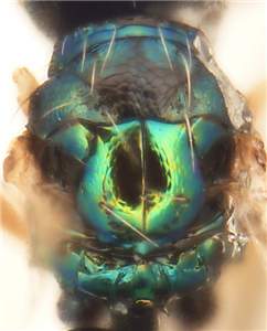 Midlobe of mesoscutum with posterior 1/3 with raised reticulation; midlobe of mesoscutum predominantly metallic dark purple and scutellum bright golden-green (all females and some males) or golden-red (some males); female hypopygium with apex drawn out in two long projections.