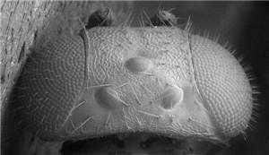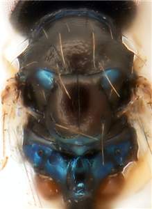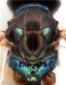 Scutellum with engraved and very weak reticulation, median groove almost complete; propodeal callus with 5-9 setae; clypeus protruding and bilobed; mesoscutum and scutellum metallic dark purple, anterior ½ of axillae bright golden-green; male flagellum with all flagellomeres distinctly separated. Colour of mesosoma similar to naevus but with long hind tibial spur and smaller eyes. See also cepheus and pyramis.