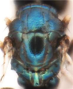 Mesoscutum and scutellum metallic bluish-green, mesoscutum with raised and rather strong reticulation, scutellum with engraved and weak reticulation; femora and tibiae dark brown; gaster with first tergite with elongate punctures. Similar to aureoviridis but notauli indistinct, and propodeum with shorter median carina.