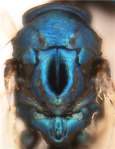 Upper frons with raised and strong reticulation; mesoscutum and scutellum metallic bluish-green; mesoscutum with raised reticulation, notauli indistinct; scutellum with engraved and weak reticulation, meshes large; propodeum with median carina with sides parallel and submedian grooves predominantly smooth.