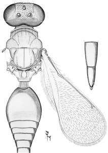 Occiput strongly convex; female scape, femora and tibiae pale brown, male scape dark brown, femora and tibiae pale brown; scutellum smooth and shiny or with engraved and very weak reticulation; forewing speculum closed below; first gastral tergite smooth with weak reticulation in posterior 1/3; female gaster elongate and acuminate, MM/LG = 0.5, 6th tergite 1.5X as long as width at base and 7th tergite 2.1X as long as width at base; female with 1st gastral tergite with anterolateral part strongly setose; dorsellum short. See also tumidus.