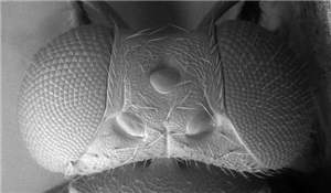 Antennal scrobes join below frontal suture; eyes large, DE/DO = 3.4; mesoscutum with raised and weak reticulation, midlobe with posterior 1/3 with engraved reticulation; scutellum smooth and shiny; mesoscutum black with metallic blue tinges, scutellum black with golden-purplish tinges; propodeal callus with three setae; femora dark brown; tibiae yellowish-white. Similar to megalomma but with smaller eyes, anterolateral foveas ±triangular and smooth, female gaster with apex rounded.