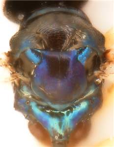 Antennal scrobes join below frontal suture; midlobe of mesoscutum with posterior 1/3 with engraved reticulation; mesoscutum metallic dark purple; scutellum without lateral mesh-rows and with a weakly indicated median groove; propodeum with median part smooth and shiny, without distinct submedian grooves and median carina, these just indicated in posterior ½; forewing speculum completely open below, i.e. without setae towards base of wing and without setae below speculum; hind tibial spur long, LS/LT = 0.45.< /FONT >