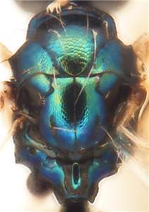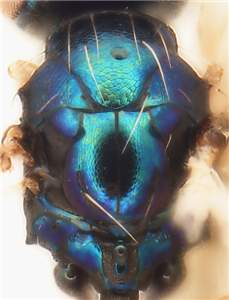 Midlobe of mesoscutum with posterior 1/3 with engraved reticulation; mesoscutum and scutellum metallic bluish-green; hind tibial spur long, LS/LT = 0.41; propodeum with median area predominantly reticulate, only anterior 4/5 of median carina smooth; female gaster elongate, MM/LG = 0.7. Similar to ticus but propodeum with median carina more narrow, almost parallel-sided, with submedian grooves wider, and female gaster longer.