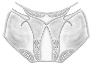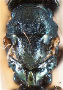 Antennal scrobes join below frontal suture; mesoscutum and scutellum with raised and strong reticulation, golden-green with blue tinges; propodeal callus with five setae; femora metallic bluish-green, tibiae pale brown; anterolateral foveas on propodeum missing; occipital margin with an edge behind ocellar triangle.