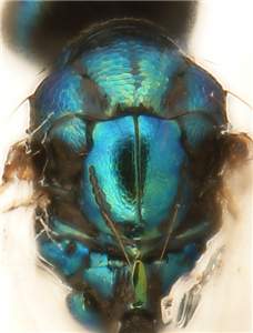 Mesoscutum and scutellum golden-green with purple tinges; mesoscutum with raised and rather strong reticulation, notauli as narrow and distinct grooves in posterior ½; scutellum with engraved and weak reticulation. Similar to aeneicollis but with shorter hind tibial spur, lateral mesh-rows on scutellum in a straight line (mesh-row in aeneicollis curved, following the curvature of scutellar margin), propodeum with posterior submedian grooves reticulate and median carina with sides parallel.