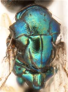 Vertex with median groove Y-shaped anteriorly; mesoscutum and scutellum metallic bluish-green; mesoscutum with raised and strong reticulation, midlobe with posterior ½ with engraved reticulation, notauli as narrow and distinct grooves throughout; propodeum with median carina long and narrow, LC/WC = 4.2, with parallel sides; female gaster elongate, MM/LG = 0.6. < /FONT >