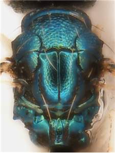 Frons between eyes and antennal scrobes, upper frons close to anterior ocellus, and on mesoscutum with raised and strong reticulation; mesoscutum and scutellum metallic bluish-green or golden-green; notauli as narrow and distinct grooves in posterior ½ ; scutellum with engraved and weak reticulation. Similar to opsiphanis but with more slender female flagellum, with stronger and larger meshes on mesoscutum, and median carina on propodeum with sides diverging towards posterior part. See also sulcatus.