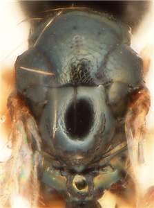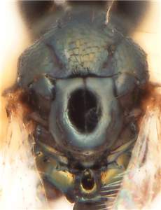 Flagellomeres short, e.g. flagellomeres 1-3 as long as wide; mesoscutum and scutellum black with metallic blue tinges, mesoscutum with raised and weak reticulation, scutellum predominantly smooth and shiny; femora and tibiae dark brown; median carina on propodeum short and wide, LC/WC = 1.8; first gastral tergite with weak punctures posteriorly. See also macrocercus and pilicornis.