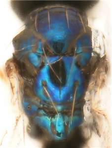 Midlobe of mesoscutum with posterior 1/3 with engraved reticulation; mesoscutum and scutellum bright metallic bluish-green; female flagellum stout; hind tibial spur long, LS/LT = 0.57; gaster elongate with apex pointed, MM/LG = 0.8. Similar to ticus but flagellum stouter, frons just above frontal suture smooth and shiny.