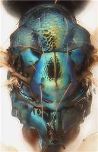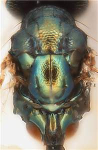 Eyes large, DE/DO = 3.5; mesoscutum and scutellum golden-green; mesoscutum entirely with raised and strong reticulation or with midlobe with posterior 1/3 with engraved reticulation, scutellum with engraved reticulation; propodeum with submedian grooves reticulate and with sides of median carina slightly diverging towards posterior part; propodeal nucha long; male flagellum with a two-segmented clava. See also caratus.