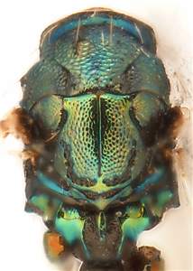 Female scape yellowish-brown; vertex with a smooth and shiny fovea behind each posterior ocellus; mesoscutum golden-green with blue tinges with raised and strong reticulation; scutellum golden-green with engraved and strong reticulation; propodeum with submedian grooves 2.4X as wide as median carina and strongly reticulate; first gastral tergite with round punctures in posterior ½.