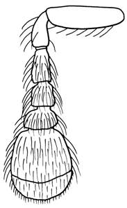 Antennal clava in female strong, 3.1X as wide as width of first flagellomere, and with a large circular sense area ventrally; clava rounded at apex; clavomere 1 shorter than 2; mesoscutum with raised and strong reticulation, scutellum predominantly smooth and shiny; female gaster long and acuminate, MM/LG = 0.8, first tergite smooth.< /FONT >
