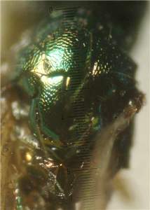 Femora yellowish-white; mesoscutum and scutellum golden-green, mesoscutum with raised and weak reticulation, scutellum with engraved and weak reticulation; tibiae yellowish-white; first gastral tergite with weak punctures posteriorly. Similar to cleodora but thoracic dorsum golden-green, antenna with first flagellomere shorter, and femora yellowish-white.