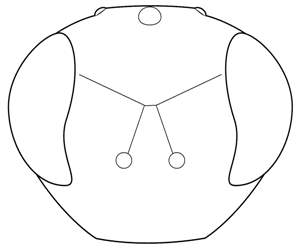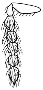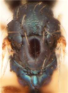 Male scape widest close to apex and narrow at base; mesoscutum metallic bluish-purple, with anterior ½ with raised and weak reticulation, posterior ½ with engraved and weak reticulation; scutellum metallic dark purple, with engraved and very weak reticulation, partly smooth; femora dark brown; tibiae yellowish-brown; first gastral tergite with weak traces of punctures in posterior part.