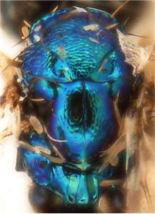 Eyes large, DE/DO = 3.3; costal cell with three setae close to submarginal vein; thoracic dorsum bright metallic bluish-green; scutellum with engraved reticulation; propodeum with submedian grooves smooth and with median carina with sides diverging towards posterior part; propodeal callus with four setae; gaster with first tergite smooth.< /FONT >