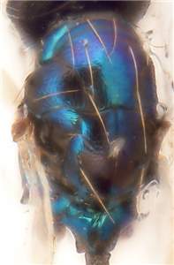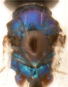 Mesoscutum metallic bluish-green, scutellum metallic dark purple; mesoscutum entirely with engraved and weak reticulation and with distinct groove-like notauli in posterior ½; female gaster elongate, MM/LG 0.7.
