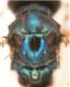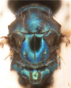 Midlobe of mesoscutum with posterior 1/3 with raised reticulation; scutellum with engraved reticulation; mesoscutum and scutellum metallic bluish-green; flagellomeres with a distinct petiole apically; hind tibial spur long, LS/LT= 0.47.