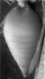 Eyes large, DE/DO = 4.3; mesoscutum metallic dark purple with raised and weak reticulation, midlobe with posterior 1/3 with engraved reticulation; scutellum metallic bluish-green.< /FONT >