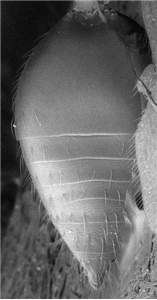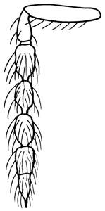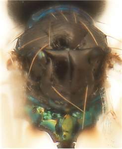 Coxae white; pedicel pale brown; eyes large, DE/DO = 3.8; scutellum smooth and shiny, or with engraved and very weak reticulation anterolaterally; propodeal callus with three setae.< /FONT >