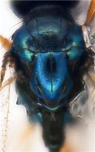 Vertex with engraved reticulation, without a median groove; mesoscutum with raised and rather weak reticulation, meshes transverse; propodeal callus with 2-5 setae; coxae dark and metallic; costal cell bare; petiole 2.5X as long as wide in female, 4.4X in male; first gastral tergite smooth and shiny; scape dark brown in both sexes; forewing speculum small; propodeum entirely reticulate medially, without median carina.
